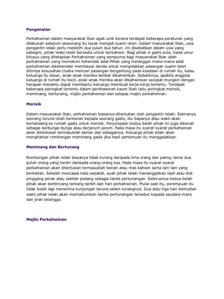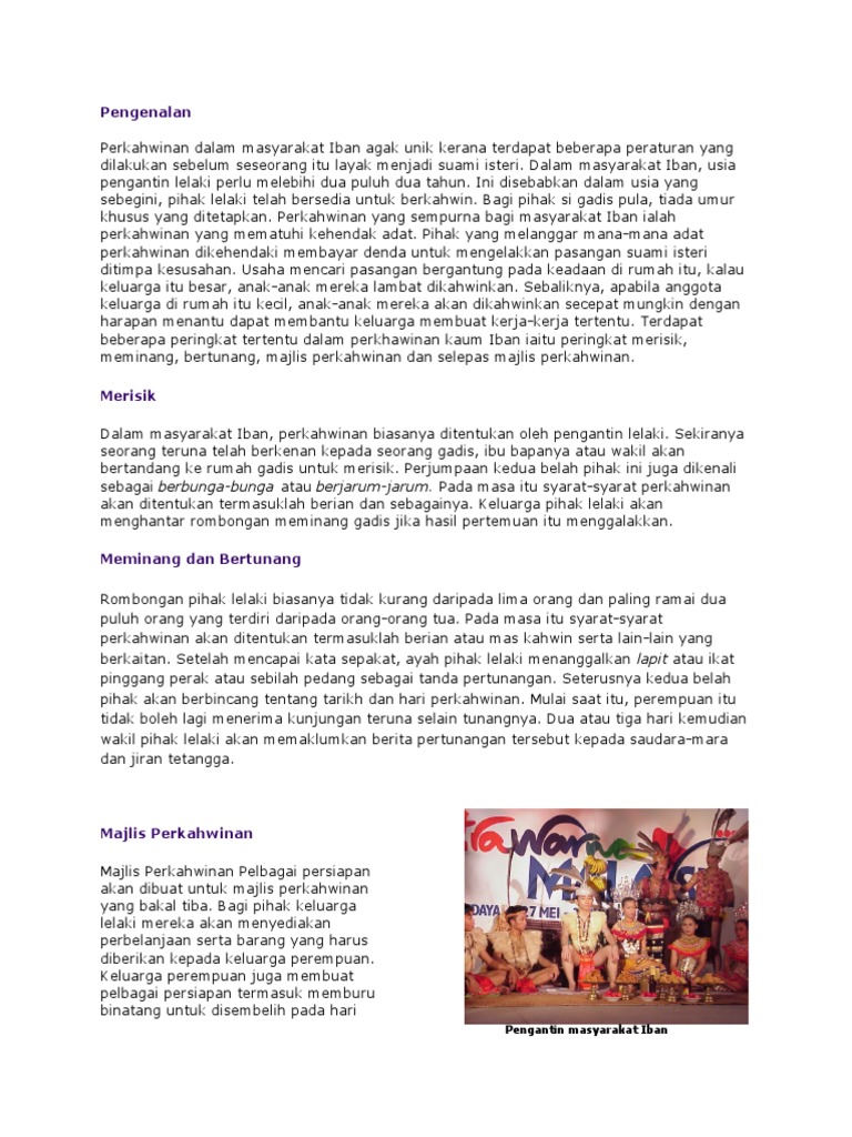 Terpantas Kaum Iban from t.eu1.jwwb.nl Peraturan serta adat resam masyarakat sabah. Adat resam kaum iban secara tradisi kehidupan masyarakat iban diatur oleh adat mereka yang amat rapat berkait dengan sostem pertanian berhuma (bumai) padi. Terdapat beberapa peringkat tertentu dalam perkhawinan kaum iban iaitu peringkat merisik, meminang, bertunang,majlis perkahwinan dan selepas majlis perkahwinan. Mereka percaya bahawa jika tidak dilaksanakan seperti yang sepatutnya maka malapetaka dan nasib malang akan menimpa. Orang iban menguruskan mayat dengan penuh kemuliaan. 'jadi mali' atau perkahwinan terlarang ini boleh kita. Terdapat pelbagai peraturan unik yang perlu dipatuhi sebelum seseorang itu layak untuk bernikah. Apabila ada kematian, semua saudara mara dan sahabat handai menghadirinya.