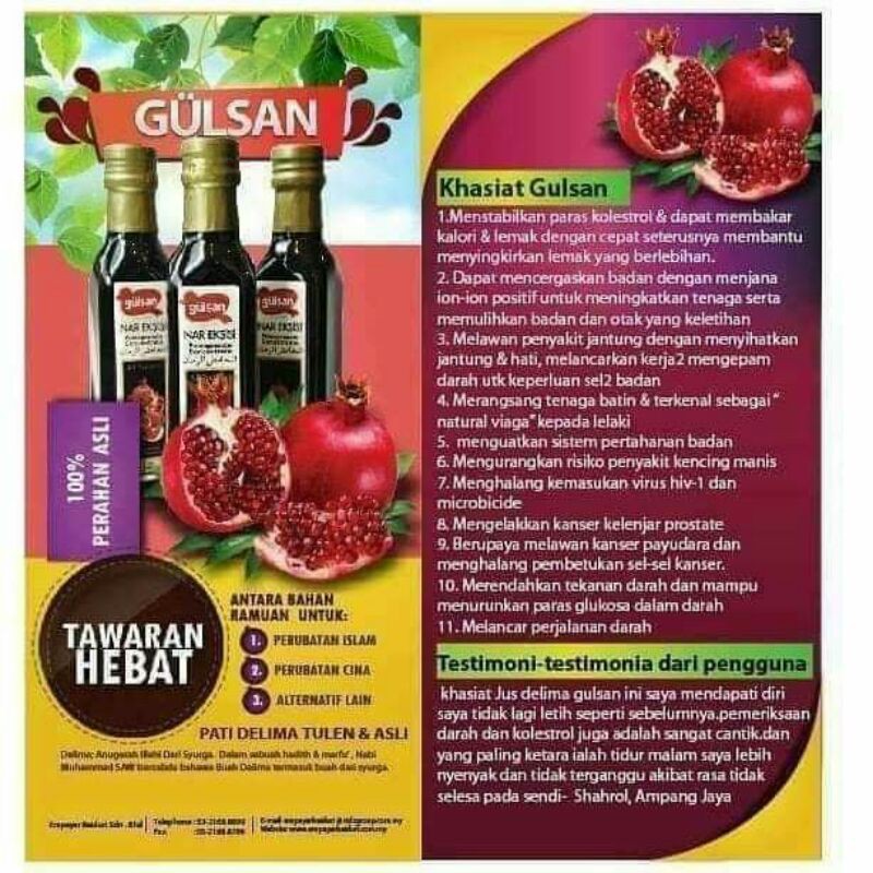 Cara Pengambilan Pati Produk Kecantikan Sijangkang Facebook from lookaside.fbsbx.com Menurut wikipedia, ia banyak ditanam di kawasan mediterranean. Dan ini adalah testimoni aku sendiri selepas mengamalkannya selama sebulan.murah je rm17 rgt sebotol. So aku nak share pasal testimoni aku yang terbaru pasal jus delima gulsan. Kebetulan bermula minggu ini, saya akan mulakan diet dan kurus secara pantas, jadi saya terfikir untuk berkongsi dengan para pembaca setia blog ini tentang cara rahsia yang awesome ini. Menggunakan buah delima yang segar ( premium ) agent wanted ! Feb 13, 2013 · testimoni benar jus delima gulsan. Sekadar perkongsian, khasiat buah delima telah dijumpai sejak 8000 tahun dahulu oleh masyarakat parsi purba, iaitu negara sekarang ialah iran. More images for jus delima gulsan untuk kurus »