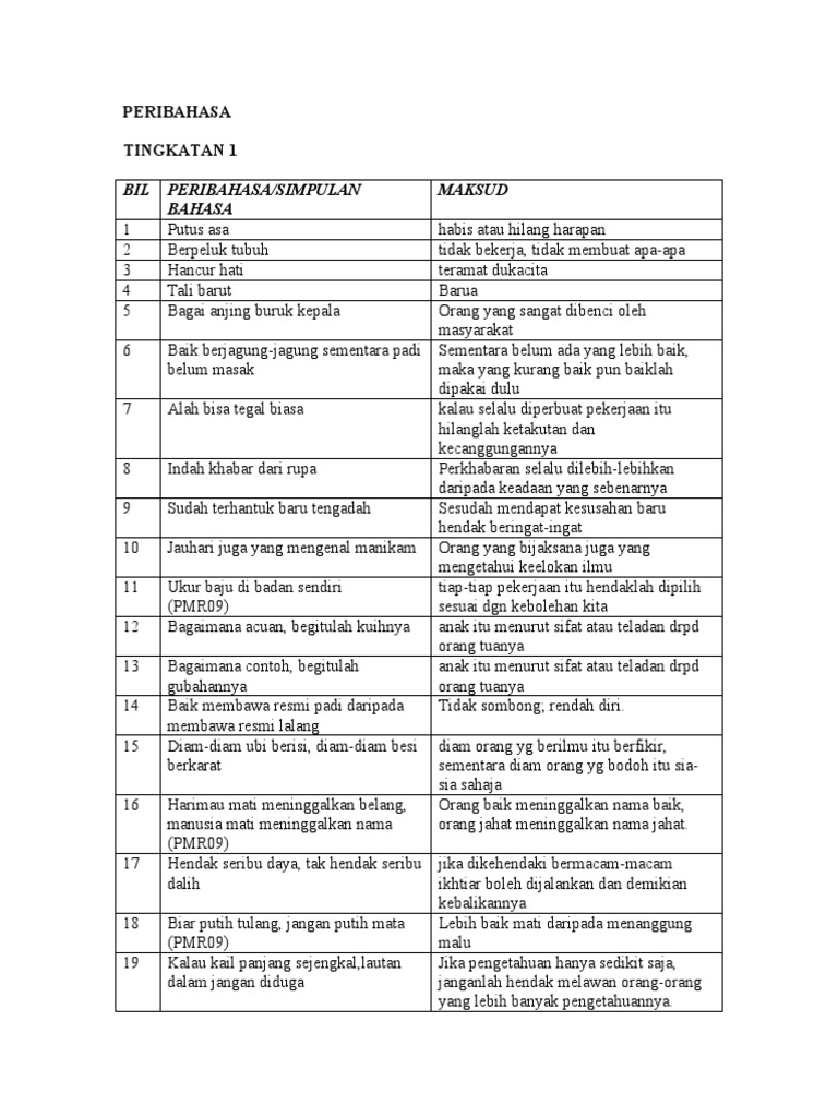 Simpulan Bahasa dan Peribahasa Dina (end 1/13/2023 12:00 AM) from c.76.my Adat yang lama tetap diamalkan di samping budaya hidup yang baru. Rupa harimau, hati tikus 8. Merangkumi semua aspek dalam sukatan pelajaran; Tikus hendak menampar kepala kucing 3. Biar putih tulang, jangan putih mata; Kemudian, bina ayat bagi setiap peribahasa dan simpulan bahasa di ruang komen yang disediakan. Senarai simpulan bahasa dan peribahasa melayu yang terdapat dalam buku teks sekolah rendah dan menengah beserta maksud di bawah adalah sebagai panduan dan rujukan pelajar. Penggunaan peri bahasa dalam penulisan karangan adalah digalakkan dan menjadi daya penarik kepada pembaca serta penanda kertas.